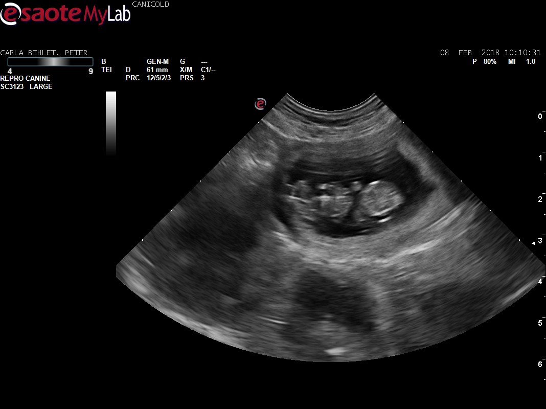 We did a pregnancy scan on Carla last week and luckily the trip to Holland was a succes. Carla is expecting puppies and the vet has set the due date at March 11th – needless to say we are very excited!! This will be our first litter in 10 years, the first litter of puppies our children will experience and our very first litter of PBGVs – so this is truly huge for us in many ways! ;o)