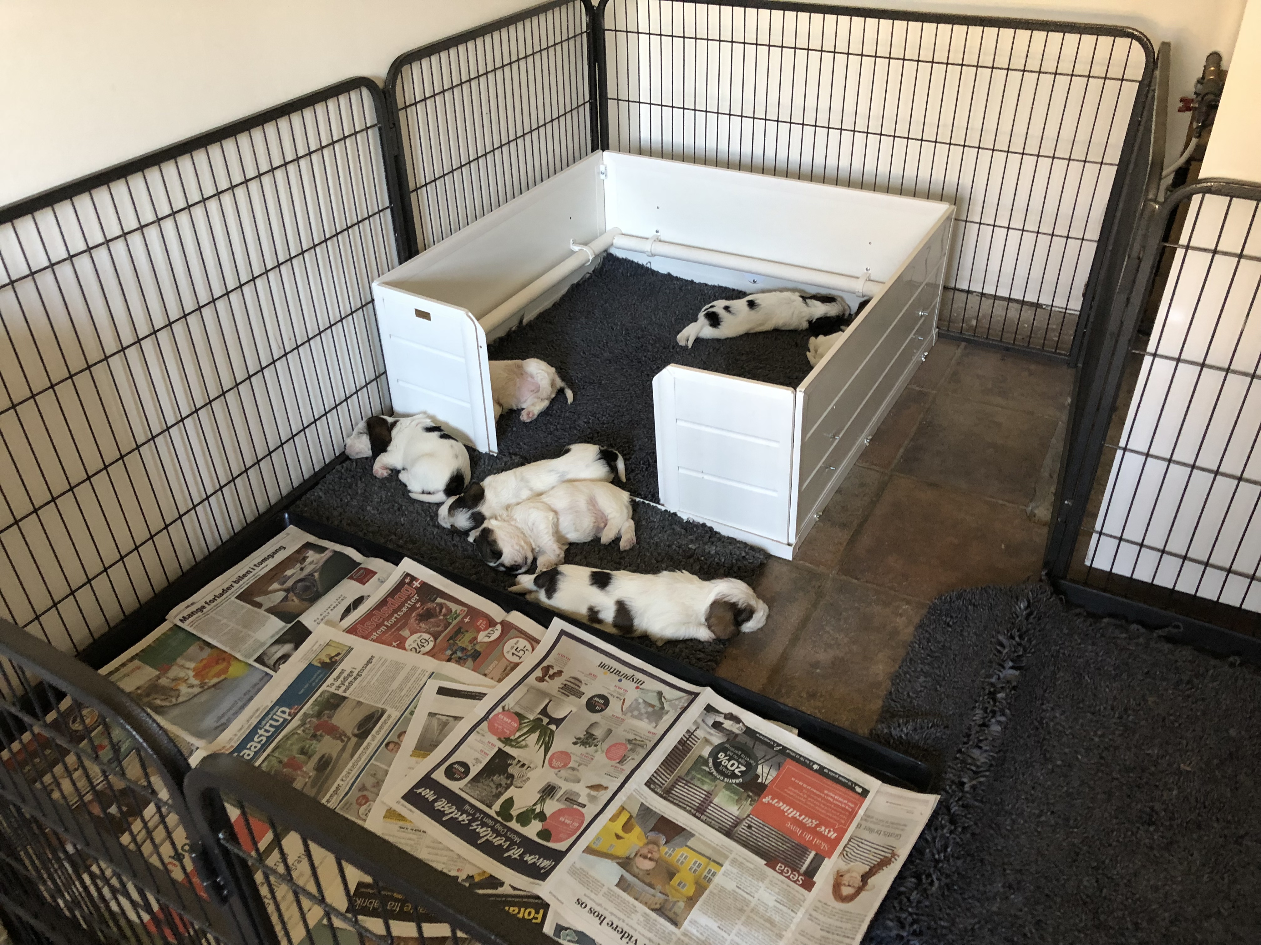 The X-litter is now 3½ weeks old and today was the day to try real food for the first time! Also, we took the boards off the entrance to the whelping box today, which means that the puppies are now free to walk in and out of the box and move around the whole puppy pen. Once they start eating real food, Carla won’t clean up after them anymore, so they will now need to go outside the whelping box and use the papers… Videos below of their very first meal. ;o) Male 1 and Female 1 were the first ones to come out of the whelping box and discover the food…but soon all 7 were gathered around the bowl… ;o)